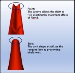 The new shape allows the shaft to flex, which ensures the maximum effect of “Namd[1](more flex and faster kick-back graphite material)” and stabilizes the racquet face by preventing the shaft twisting, increasing control